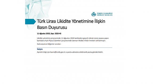 TCMB tarafından yapılan açıklamada, ' Likidite yönetimi çerçevesinde 12 Ağustos 2020 tarihinden geçerli olmak üzere piyasa yapıcı bankalara Açık Piyasa İşlemleri çerçevesinde tanınan likidite imkân limitleri sıfırlanmıştır.' ifadelerine yer verildi.