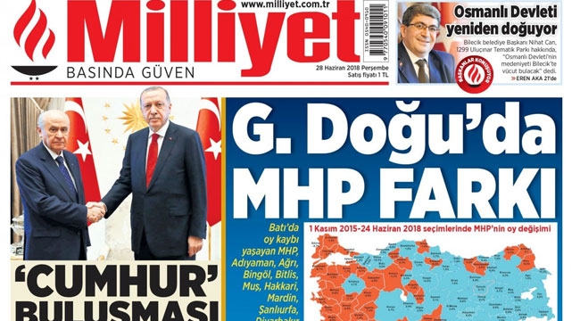 Milliyet ikinci manşetinde Batı'da oy kaybı yaşayan MHP, Adıyaman, Ağrı, Bingöl, Bitlis, Muş, Hakkari, Mardin, Şanlıurfa, Diyarbakır ve Şırnak'ta oylarını artırdı haberine yer veren gazete, "G.Doğu'da MHP Farkı" manşetini attı.