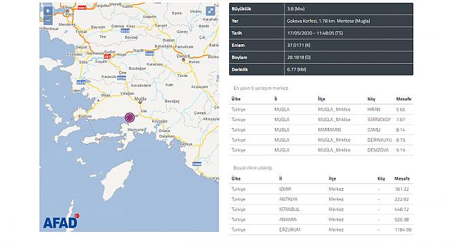 Afet ve Acil Durum Yönetimi Başkanlığı Deprem Dairesi (AFAD) tarafından açıklanan son dakika deprem verilerine göre bugün saat 11.48'te Gökova Körfezi açıklarında büyüklüğü 3.8 olan deprem yaşandığı kaydedildi. Deprem Muğla'nın merkez ilçesi Menteşe'nin kırsal Kıran, Sarnıçköy, Denizova ve Derinkuyu ile Marmaris'in Çamlı mahallelerinde hissedildi. Muğla Gökova depremi yerin yaklaşık 6.77 kilometre derinlerde meydana geldiği bildirildi.