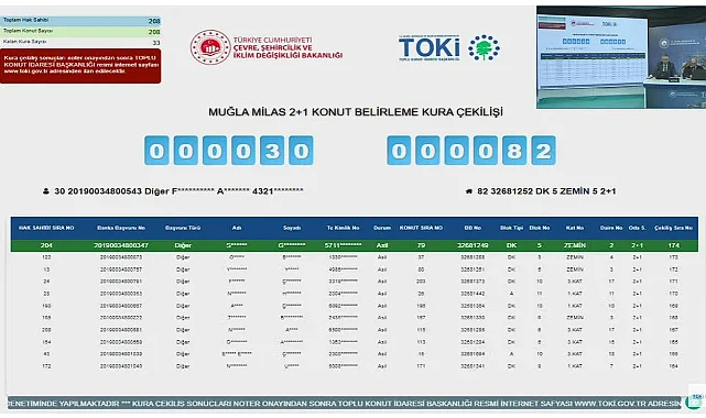 208 adet 2+1 daire seçeneği için 208 başvuru, 90 adet 3+1 daireler için ise 90 başvuru arasından TOKİ 100 Bin sosyal konut kampanyasında Muğla projesinde kura işlemi Noter huzurunda tamamlandı.