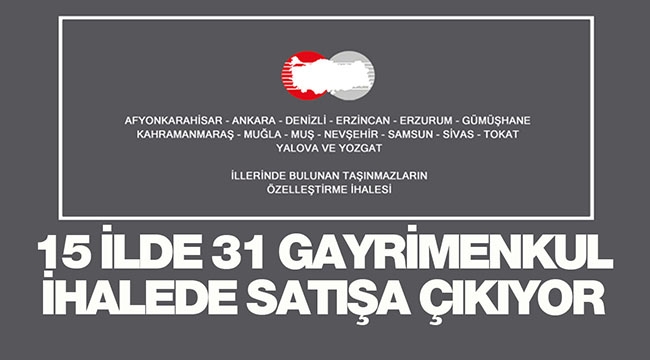ÖİB tarafından yapılan açıklamada; Ankara, Tokat, Afyonkarahisar, Denizli, Yalova, Yozgat, Sivas, Nevşehir, Muş, Kahramanmaraş, Erzurum, Erzincan, Gümüşhane, Muğla ve Samsun illerinde bulunan toplam 31 gayrimenkul için satış ihaleler düzenleneceği kaydedildi.