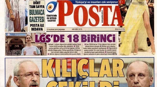 Posta gazetesi ana sayfasında bu sabah, CHP Lideri Kılıçdaroğlu, "Başkanlığı, İnce'ye bırak" çağrısına "Koltuk sevdalılarının partide işi yok" yanıtını verdi. Bu açıklama sonrası Muharrem İnce meydanlara çıkacağını duyurup resti çekti. Kısa süre sonra CHP Genel Merkezi'nin önünde Kılıçdaroğlu Çekil talebiyle oturma eylemi başlattı haberine geniş yer veren gazete, "Kılıçlar Çekildi" manşletini attı.