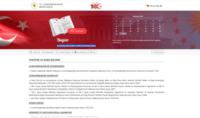26 Temmuz 2022 Tarihli ve 31904 Sayılı Resmî Gazete yürürlüğe girerken, ülke genelinde uygulamada olacak hangi yeni kararlar alındı? Bugün yayımlanan Resmi Gazete'de kritik atama kararları, yönetmelik ve tebliğler yürürlüğe girdi.