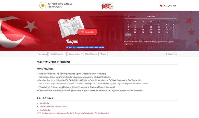 28 Mart 2022 Tarihli ve 31792 Sayılı Resmî Gazete