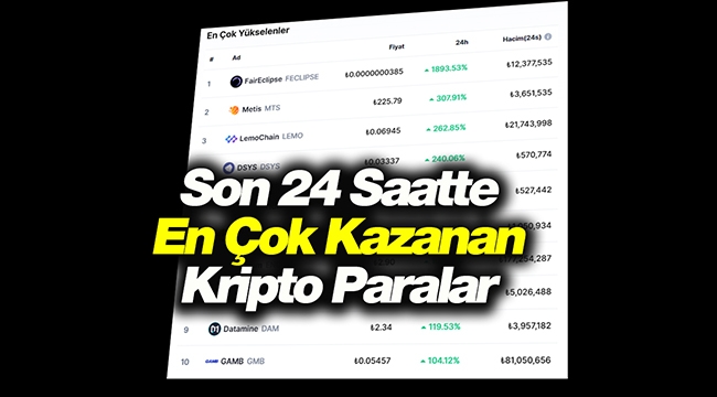 CoinMarketCap tarafından listelenen ve son 24 saat içinde, 50.000 dolar üzeri hacme sahip kripto para ve token'lardan en çok kazanan veya kaybedenler hangileri? İşte bugünün kazanan ve kaybeden 10 kripto parası...