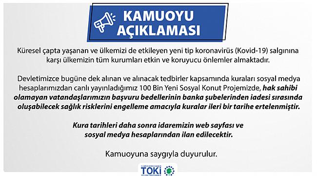 İlgili resmi açıklama TOKİ tarafından sosyal medya hesapları üzerinden paylaşıldı. Böylece noter huzurunda yapılan çekilişlerin ertelenmesiyle başlayan süreç tüm kura çekilişlerinin iptal edilmesiyle devame diyor. TOKİ kura çekilişlerini ilerleyen tarihlere ertelerken, kura çekilişleri hakkında bilgiler sosyal medya hesaplarından paylaşılacak.