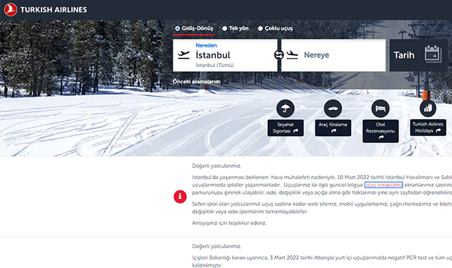 İstanbul’da yaşanması beklenen hava muhalefeti nedeniyle, 10 Mart 2022 tarihli İstanbul Havalimanı ve Sabiha Gökçen Havalimanı uçuşlarımızda iptaller yaşanmaktadır. Uçuşlarınız ile ilgili güncel bilgiye THY uçuş sorgulama ekranlarımız üzerinden; uçuş numaranızı veya parkurunuzu girerek ulaşabilir, iade, değişiklik veya açığa alma gibi haklarınızı yine aynı sayfadan öğrenebilirsiniz.