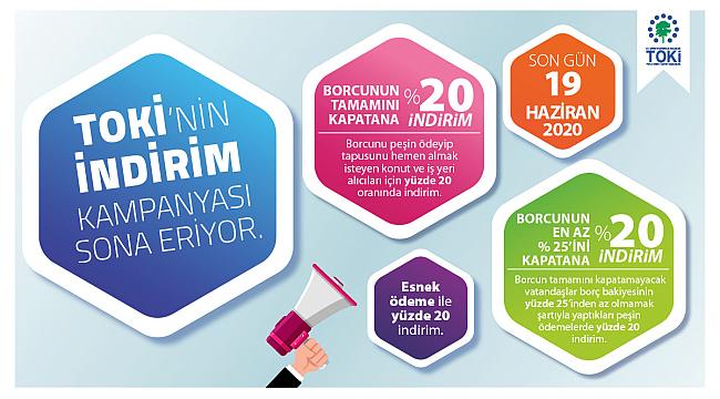 TOKİ'nin, borcunu ödeyip tapusuna hemen sahip olmak isteyen konut ve iş yeri alıcıları için 6 Mayıs'ta başlattığı yüzde 20 indirim kampanyasına, faizlerin düşmesiyle katılım bir önceki döneme göre artış gösterdi. Kampanyadan şimdiye kadar 14 bin 281 kişi yararlandı.