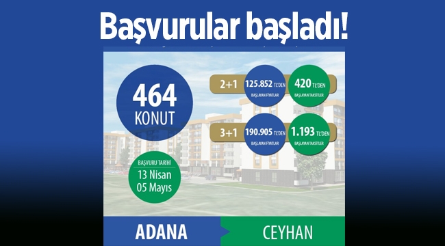 TOKİ Adana Ceyhan konut projesi kapsamında hayata geçirilen 464 eve başvurular alınmaya başlanırken, satışlar kura çekilişi yöntemiyle gerçekleştirilecek. TOKİ tarafından Adana Ceyhan'da üretilmekte olan 2+1 nitelikli 296 konut Alt Gelir Grubu kapsamında, 3+1 nitelikli 168 adet konut Orta Gelir Grubu kapsamında olmak üzere toplam 464 konut kuralı satış yöntemi ile satışa sunulmuştur. Başvurular 13 Nisan - 05 Mayıs 2017 tarihleri arasında, Alt Gelir Grubu konutlar için Türkiye Halk Bankası A.Ş. Adana İli Şubelerine, Orta Gelir Grubu konutlar için Türkiye Halk Bankası A.Ş. ülke geneli şubelerine yapılacaktır.