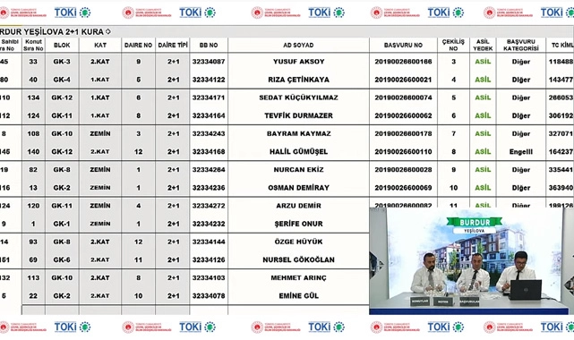 164 adet 2+1 konut için 164 hak sahibi, 72 adet 3+1 konut için ise 72 hak sahibi bulunan TOKİ Burdur Yeşilova konut projesinde kura çekilişi ile hak sahipleri belirlenmiş oldu.