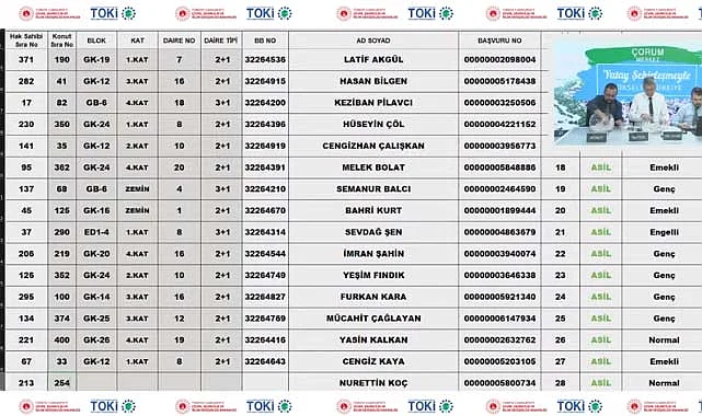 TOKİ Çorum Merkez 2+1 kura sonuçları, TOKİ Çorum Merkez 3+1 kura sonuçları isim sorgulama işlemini altta verilen bağlantıdan canlı yayını tekrar inceleyebilir, kura sonuçları isim listesini görebilirsiniz.