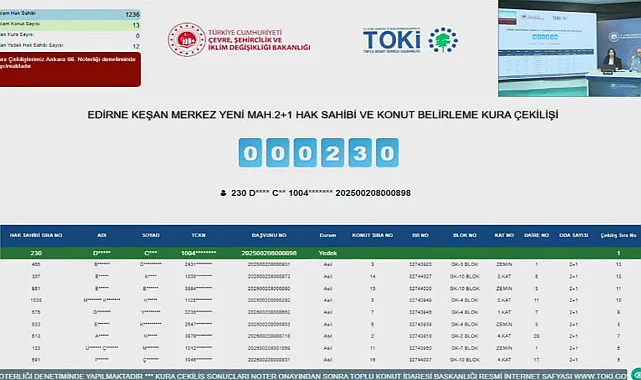 Edirnelileri yakından ilgilendiren konut haberi TOKİ'den geldi. Çok sayıda vatandaşın başvurduğu evler için merakla beklenen kura haberi bugün düzenlenen çekilişle tamamlandı. TOKİ Edirne'de yer alan projeler için hak sahipliği konut belirleme işlemini tamamladı. Edirne Keşan TOKİ projesinde inşa edilen evlerin hak sahipliği konut belirleme kura sonuçları Noter huzurunda, canlı yayınlandı.
