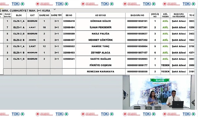 7 adet 3+1 konut için ise 9 başvuru alınan TOKİ Elazığ Merkez Cumhuriyet Mahallesi toplu konut projesinde kura çekilişi ile hak sahipleri belirlenmiş oldu.