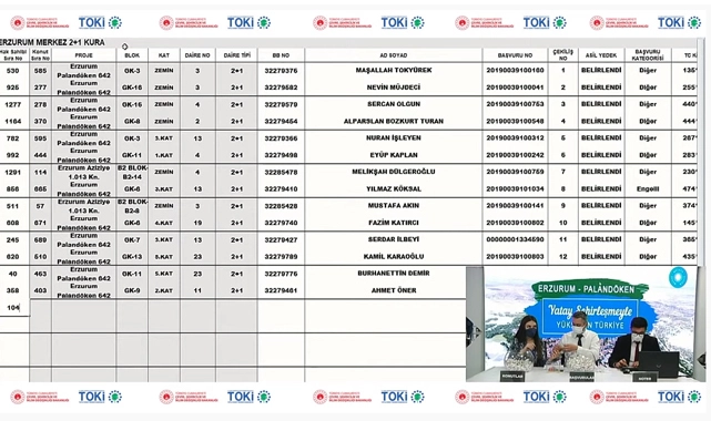 TOKİ Erzurum Palandöken konut projesi kapsamında 700 adet 2+1 konut için 1303 hak sahibi sayısı bulunurken, 252 adet 3+1 konut için ise 726 hak sahibi sayısı bulunuyordu. Hak sahipleri arasında düzenlenen kura çekilişinde 952 adet konutta oturacak isimler belirlenmiş oldu.
