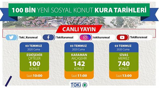 TOKİ 3 Temmuz 2020 Cuma; Eskişehir, Karaman ve Sivas illerinde hayata geçirilecek 100 bin konut projeleri çerçevesinde sosyal konutlar için yapacağı kura çekilişini canlı yayınlardan Twitter, Facebook, YouTube ve İnstagram sayfaları üzerinden online olarak canlı izleyebilirsiniz.