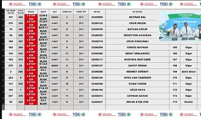 TOKİ Eskişehir Odunpazarı 2+1 kura sonuçları, TOKİ Eskişehir Odunpazarı 3+1 kura sonuçları isim sorgulama işlemini altta verilen bağlantıdan canlı yayını tekrar inceleyebilir, kura sonuçları isim listesini görebilirsiniz.