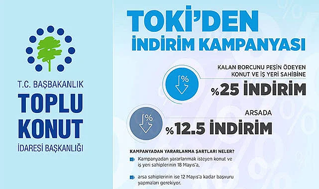 Bakan Kurum, TOKİ indirim kampanyasının ayrıntılarını sosyal medya üzerinden paylaştı. TOKİ %25 indirim kampanyasının ayrıntılarını görmek için bakınız.