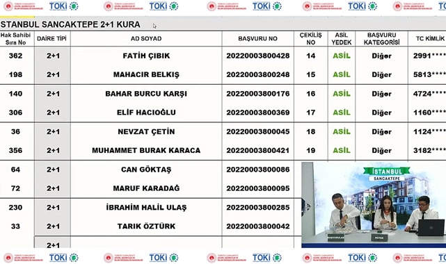 TOKİ İstanbul Sancaktepe 2+1 ve 3+1 konut kura sonuçları isim listesi sorgulama ekranı.