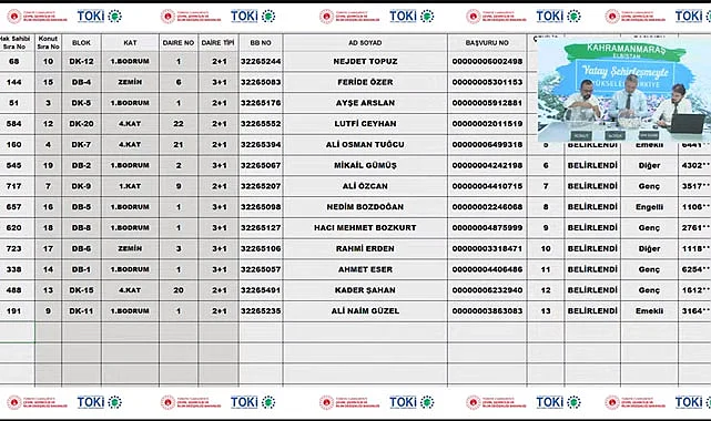 TOKİ Kahramanmaraş Elbistan 2+1 kura sonuçları, TOKİ Kahramanmaraş Elbistan 3+1 kura sonuçları isim sorgulama işlemini altta verilen bağlantıdan canlı yayını tekrar inceleyebilir, kura sonuçları isim listesini öğrenebilirsiniz.