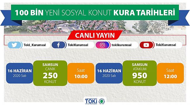 TOKİ 16 Haziran 2020 Salı; Samsun Canik ve Atakum ilinde yer alan sosyal konutlar için yapacağı kura çekilişini canlı yayınlardan Twitter, Facebook, YouTube ve İnstagram sayfaları üzerinden online olarak canlı izleyebilirsiniz.