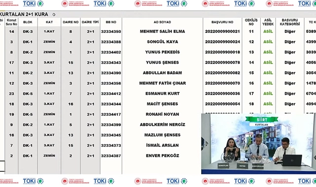 24 adet 2+1 konut için 77 başvuru, 12 adet 3+1 konut için ise 89 başvuru alınan TOKİ Siirt Kurtalan konut projesinde kura çekilişi ile hak sahipleri belirlenmiş oldu.