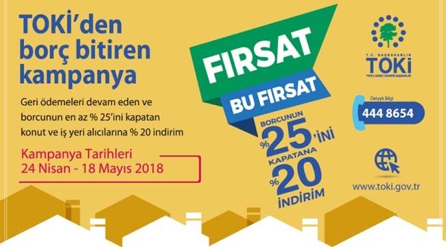 TOKİ'nin geleneksel hale gelen yüzde 20 indirim kampanyası 24 Nisan – 18 Mayıs 2018 tarihleri arasında ilgili bankaya başvuruda bulunanlar yararlanabilecekler. Bu tarihten sonra yapılacak borç kapatmalarında söz konusu indirim oranından yararlanılması mümkün olmayacak.