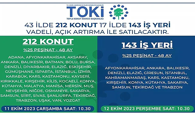 Çevre, Şehircilik ve İklim Değişikliği Bakanlığı Toplu Konut İdaresi Başkanlığı (TOKİ), 43 ilde 212 konut ile 17 ilde 143 iş yerini 11-12 Ekim 2023 tarihlerinde açık artırma yöntemiyle satışa çıkaracak.