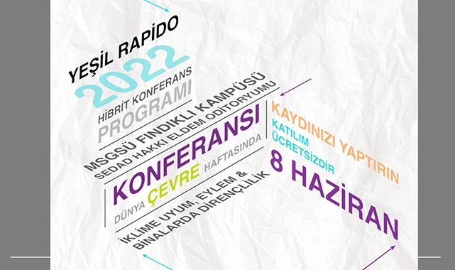 Bu yıl 9. kez düzenlenecek olan Yeşil Rapido 2022 Konferansı; Dünya Çevre Haftası’nda 8 Haziran 2022 tarihinde, MSGSÜ iş birliği ile Mimar Sinan Üniversitesi’nin Fındıklı Yerleşkesi Sedad Hakkı Eldem Oditoryumu’nda ‘İklime Uyum, Eylem ve Binalarda Dirençlilik’ temasıyla gerçekleşecek.