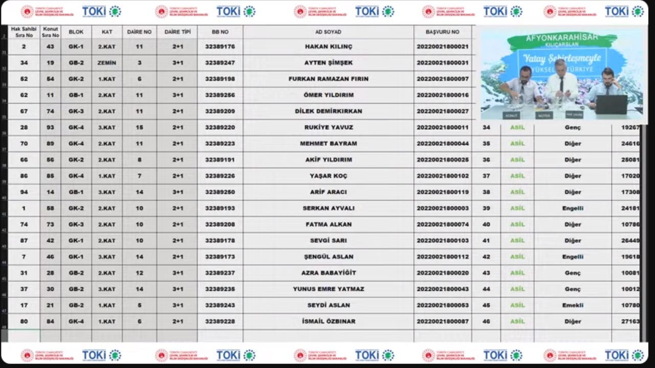 TOKİ'den ucuz konut sahibi olmak isteyen milyonların takip ettiği İlk Evim Konut kampanyası dahilinde konutlar için başvurusu tamamlanıp, hak sahipliği kurasını bekleyenler için kura çekimi sürüyor.Emlak Pencerem / TOKİ Haberleri - 31 Ağustos 2023 - İstanbulTOKİ Afyonkarahisar Kılıçarslan toplu konut projesinde yer alan toplamda 94 adet ev için hak sahipliği konut belirleme kura çekilişi toplamda 94 başvuru arasından gerçekleştirildi. Afyonkarahisar Kılıçarslan TOKİ toplu konut projesi kapsamında hayata geçirilen 94 konutun hak sahipliği konut belirleme kurası Noter huzurunda, canlı yayında tamamlanarak hak sahipleri isim isim belirlenmiş oldu.Toplu Konut İdaresi Başkanlığı (TOKİ) İlk Evim Konut, İlk Evim İşyerim 250 Bin Sosyal Konut kampanyası ve diğer kampanyalar dahilinde evlerin hak sahipliği konut belirleme kura çekilişlerini aralıksız sürdürüyor. Bu kapsamda bugün TOKİ Afyonkarahisar Kılıçarslan hak sahipliği konut belirleme kurası Noter huzurunda çekilerek tamamlandı. TOKİ Afyonkarahisar Kılıçarslan kura sonuçları isim listelerini altta canlı yayın videosundan veya ilgili TOKİ haberinden inceleyebileceksiniz.