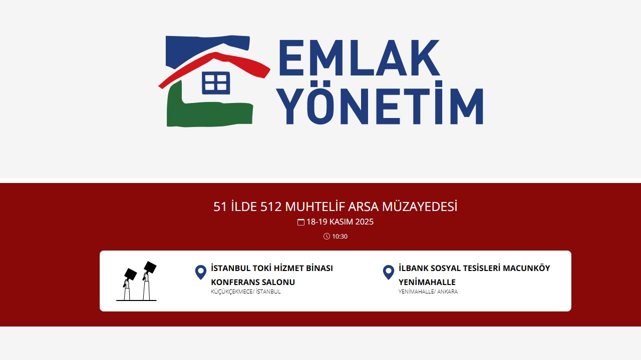 Arsa sahibi olmak isteyenler, yatırım yapmak isteyenler için kaçırılmayacak toprak fırsatı. emlak müzayede üzerinden yapılacak ihalelere bir yenisi eklendi. Türkiye genelinde toplam 51 ili kapsayan arsa satış ihalesi için geri sayım başladı.Emlak Yönetim ve Emlak Müzayede tarafından gerçekleştirilecek arsa satış ihalesine dair ayrıntılar paylaşıldı. Arsa yatırımı yapmak, kendi arsası üzerine konut yapmak isteyenler için cazip fırsatların bulunduğu 512 arsa için satış ihalesi 18-19 Kasım tarihlerinde düzenlenecek. Online olarak katılım yapılabilecek arsa satış ihalesi Emlak Müzayede üzerinden online olarak takip edilebilecek.“51 İLDE 512 MUHTELİF ARSA MÜZAYEDESİ”Tarih ve saat: “18-19 KASIM 2025” • “10:30”Konum kartı (ikonlarla):İstanbul Toki Hizmet Binası Konferans Salonu