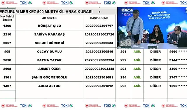 TOKİ'nin müstakil arsa kuralarında İlk Evim Arsa Erzurum kura çekilişi bugün noter huzurunda gerçekleştirildi ve kura sonuçlarına ilişkin isim listesi belli oldu. Erzurum TOKİ 500 adet müstakil arsa için başvurular arasından kura çekimi tamamlandı. Erzurum TOKİ arsa kura çekilişi sonuçları ise canlı yayında isim isim belirlendi. Kura sonuçları, e-Devlet kapısı turkiye.gov.tr üzerinden TOKİ Başvuru ekranından online sorgulanabilecek.
