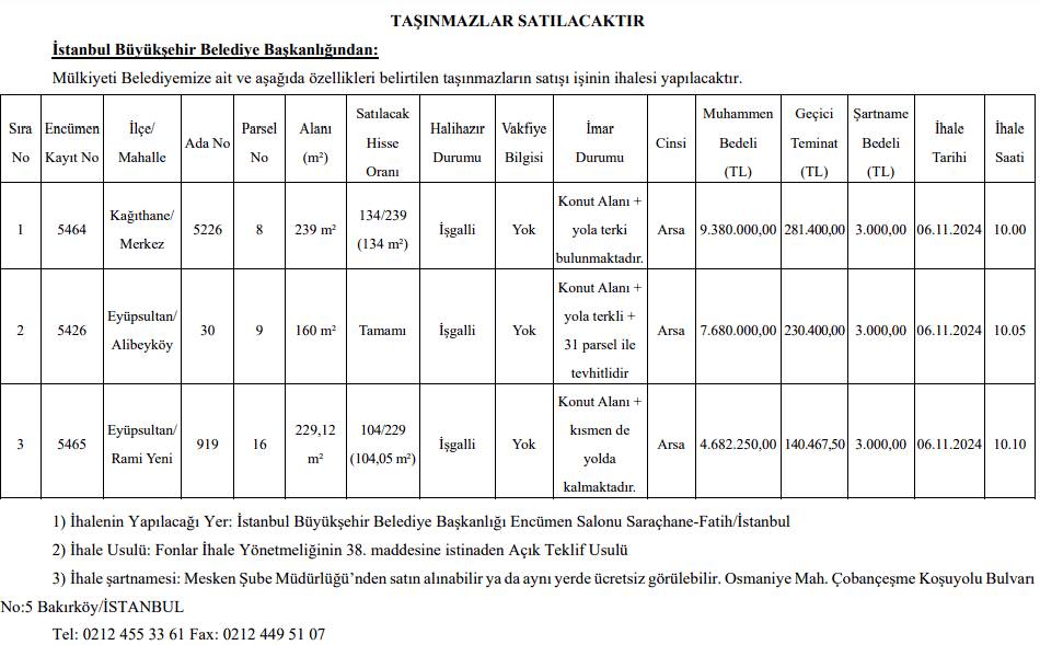 İstanbul Büyükşehir Belediye Başkanlığı (İBB) yeni bir emlak satış ihalesi açtı. İstanbul'da Kağıthane ve Eyüpsultan ilçelerinde bulunan toplam 3 arsa için satış ihalesi açıldı. 6 Kasım tarihinde düzenlenecek ihalede 3 farklı arsa yatırımcıya sunulacak. İhale ilanı 25 Ekim tarihli Resmi Gazete'de yayınlanarak yürürlüğe girdi.İstanbul Büyükşehir Belediye Başkanlığından: Mülkiyeti Belediyemize ait ve aşağıda özellikleri belirtilen taşınmazların satışı işinin ihalesi yapılacaktır. Açık teklif usulü gerçekleştirilecek arsa satış ihalesi 6 Kasım tarihinde yapılacak.İhalenin Yapılacağı Yer: İstanbul Büyükşehir Belediye Başkanlığı Encümen Salonu Saraçhane-Fatih/İstanbulİhalede satışa çıkacak arsalar ise şöyle;Kağıthane merkezde 239 metrekare büyüklüğünde konut alanı imarlı arsa 9 milyon 380 bin TL muhammen bedelle satılacak.Eyüpsultan Alibeyköy'de 160 metrekare büyüklüğünde konut imarlı arsa 7 milyon 680 bin TL muhammen bedelle satılacak.Eyüpsultan Rami'de ise 229 metrekare büyüklüğünde konut imarlı arsa 4 milyon 682 bin TL muhammen bedelle açık teklif usulü satışa çıkarıldı.İhaleye dair ayrıntılı bilgiler 25 Ekim tarihli Resmi Gazete'de yer almaktadır.