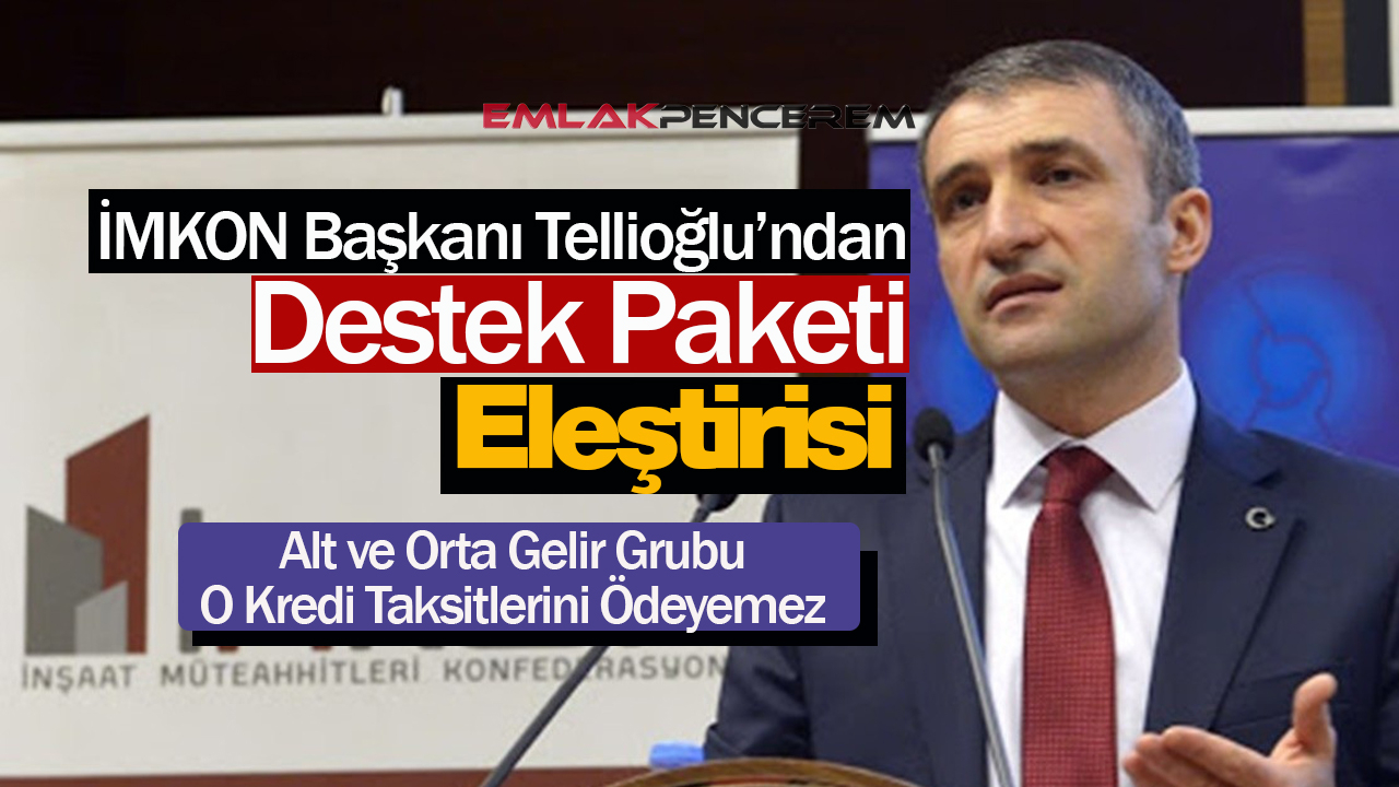İnşaat Müteahhitleri Konfederasyonu (İMKON) Genel Başkanı Tahir Tellioğlu, Cumhurbaşkanı Erdoğan'ın vatandaş ve müteahhitler için sunduğu destek paketi ile alakalı önemli eleştirilerde bulundu.Özellikle alt ve orta gelir grubunun 2 milyon TL gibi bir kredi taksidinin ödemesinin mümkün olmayacağının altını çizen İMKON Başkanı Tellioğlu, "sektör temsilcilerinin görüşü alınarak düzenleme yapılmasının maksada daha uygun faydalı sonuçlar verebilir." eleştirisinde bulundu.Tellioğlu, sosyal medya hesabından yaptığı paylaşımında, "Cumhurbaşkanımızın konut sektörüne verdiği desteğe teşekkür ederiz.
