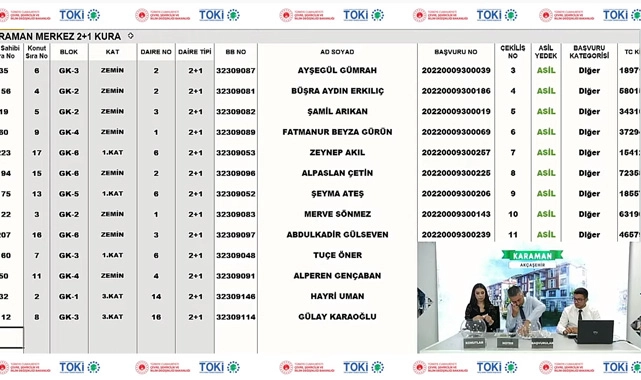 18 adet 2+1 konut için 238 başvuru, 1 adet 3+1 konut için ise 242 başvuru alınan TOKİ Karaman Akçaşehir toplu konut projesinde kura çekilişi ile hak sahipleri belirlenmiş oldu.